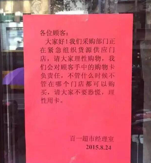 8月24日晚,百一超市通过各门店张贴、喇叭播报和网络平台发出“温州百一超市告广大顾客”一封信:“大家好!我们采购部门正在紧急组织货源供应门店,请大家理性购物,我们会对顾客手中的购物卡负责任,不管什么时候不管在那个门店都可以购买,请大家不要恐慌,理性用卡。”