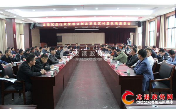 龙港政务网4月14日讯:昨天下午,龙港镇召开试点行政管理体制改革社区村居代表座谈会。县镇领导苏庆明、丁振俊、上官光强、陈为来、李孝取、金珍敏等出席会议。