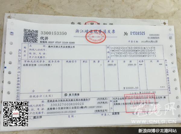 当日上午8点,龙港居民杨小姐预约来到地税办税服务窗口来办理增值税发票。发票是开给温州万朗工艺品有限公司的,“货物或应税劳务名称”为出租非住房,金额1万元。据了解,营改增试点启动后,二手房交易和个人出租不动产业务增值税由地税部门代征,这张发票也是营改增后龙港地税为个人出租不动产业务纳税人开具的首张增值税发票。