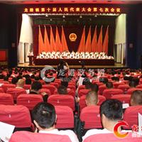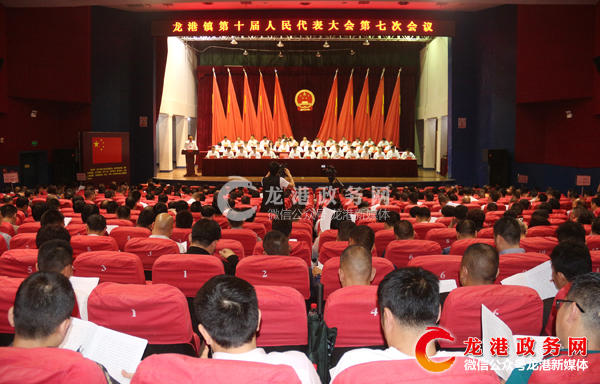 大会会场主席台上方悬挂着“龙港镇第十届人民代表大会第七次会议”的醒目横幅。主席台后方10面鲜艳的红旗簇拥着庄严的国徽。