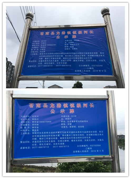 近日,龙港镇168条河道的河长公示牌全部进行更新,更新后的公示牌上显示的内容包括:河道名称、河道长度、起止地点,以及镇级河长姓名、电话、职务,河道警长、联络员、巡查员、村级河长等河道团队人员的详细资料,同时,公示牌上还显示工作职责、整治目标,还附上了监督电话,接受群众的投诉举报。