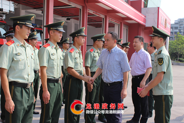 慰问中,陈为来一行首先来到龙港消防队,与消防官兵们一一握手,祝福他们节日快乐,并对龙港消防官兵一直以来在维护社会稳定、积极消除安全隐患等方面工作给予充分肯定,希望消防武警官兵要再接再厉,切实提高消防技能,及时、有效地消除各类消防安全隐患,更好地确保龙港人民群众生命财产安全。