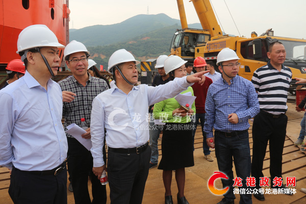 龙港网9月15日讯:日前,由县人大常委会主任苏庆明带领的视察组,对我镇重点工程项目进展情况进行实地检查。县镇领导王忠秀、张小敏、李孝取、陈为来、朱文胜、赵凯等陪同视察。