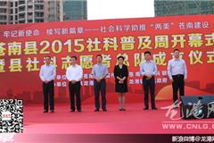 为了提升公民思想道德水平和科学文化素质,通过社会科学助推“两美”苍南建设,今天上午,苍南县2015年社会科学普及周活动在龙港财富广场拉开序幕,现场还举行苍南县社科志愿者总队成立仪式。县委常委、宣传部长林森森宣布活动开幕,县人大副主任高亚男、县长林小同、县政协副主席黄邦领、龙港镇委副书记、镇长陈为来、镇委委员朱文胜及县、镇有关部门负责人出席开幕式。