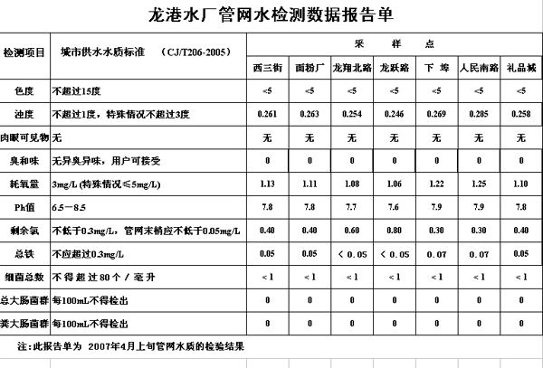 龙港水厂出厂水常规项目检测4月上旬数据报告单