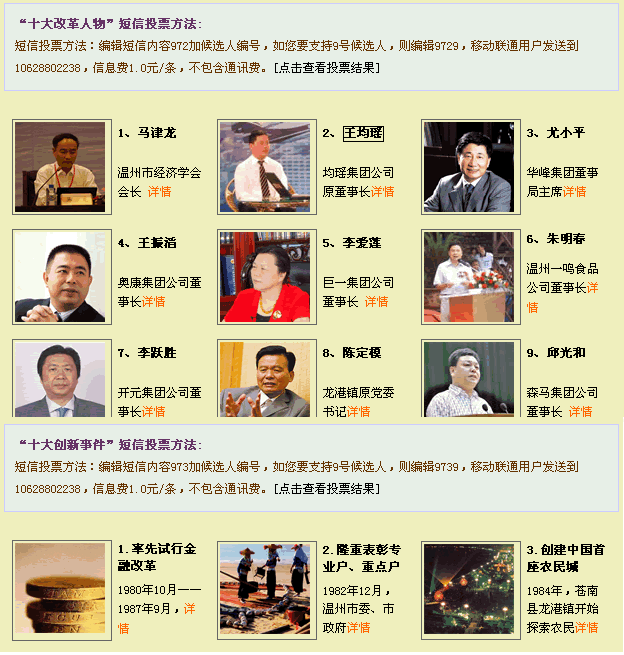 由中共温州市委宣传部、温州日报报业集团、温州市广播电视总台联合组织开展的改革开放30年温州“十大改革人物、十大创新事件、十大创业成果”评选活动,在各地各部门推荐、群众联荐、个人自荐的基础上,评选活动组委会办公室根据评选条件,经有关领导、专家学者评议及征求各方面意见后,现确定以下人员、事件、成果为候选对象,予以公示投票。