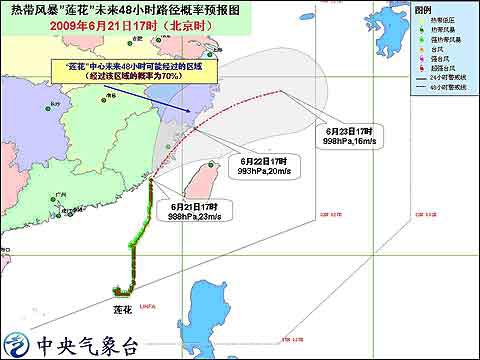 中央气象台2009年6月21日18时发布台风橙色警报:今年第3号热带风暴“莲花”(LINFA)的中心今天下午5时位于福建省晋江近海海面上,就是北纬24.2度,东经118.5度,中心附近最大风力有9级(23米/秒)。
