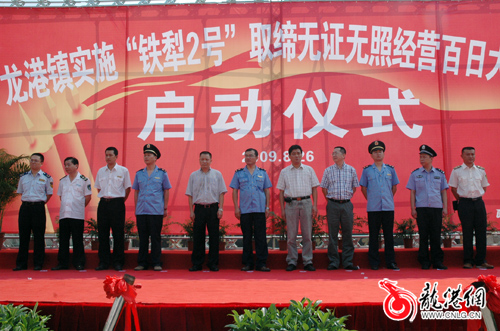 本网讯:8月26日上午,“铁犁2号”取缔无证无照经营百日大汇战在我镇正式启动。镇人大主席上官光强,副镇长方崇亮及公安、安监、工商、质监等职能部门负责人和城南、城北、龙江、沿江办事处分管负责人出席了启动仪式。