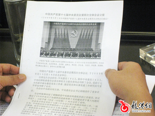 陈如奏和大家一起认真阅读了十七届四中全公报,然后作中心发言,畅谈学习体会。他说:四中全会是在新中国成立60周年之际,在应对国际国内重大挑战、推动党和国家事业实现新发展的关键一年召开的一次具有重要意义的会议。全会面对新的世情、国情、党情,保持了理性、清醒的头脑,高瞻远瞩地研究党建重点、破解党建难点、回应党建热点、提升党建高点,浓重抒写了党在执政中的自身建设宝贵经验,全面把握党内民主发展的新高度,新解少数领导干部腐败、执政能力不强等重大现实问题,筑牢执政党的组织之基、民意之基、思想之基。特别是冷静面对“四大考验”,提出“五大建设”目标,对当前和今后一个时期加强和改进党的建设做出了全面部署,形成了执政党建设的科学布局,这是60年我党执政史上一件非常有意义的大事,标志一个党建新阶段的开始。