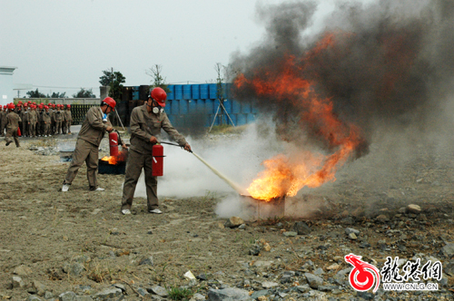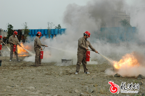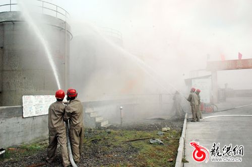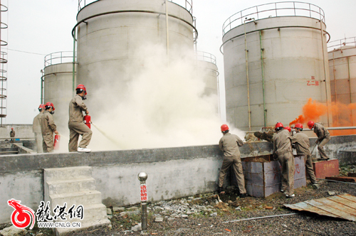 当日下午3点正,根据演练预案,温州瑞普三利高分子材料有限公司甲类车间内因桶装物料泄漏,遇到明火发生火灾事故,现场人员立即采取应急措施组织人员进行灭火,同时,迅速组织工人有条不紊地进行疏散,报生产控制中心和119火警,生产指挥中心根据险情启动应急救援预案,各应急救援小组投入救援工作。随后,在公司原料2号罐,因管道阀门损坏造成泄漏,遇高温天气发生燃烧事故,具有强腐蚀性的危化气体开始渗漏,顿时黄色的烟雾弥漫开来。对此,救援小组第一时间展开自救,用消防沙和干粉灭火器进行灭火,再用水枪对罐体喷水降温。为了避免罐体高温爆炸,工人立即启动储罐自动喷水系统,进行降温保护。