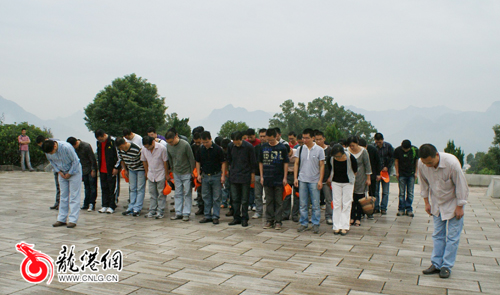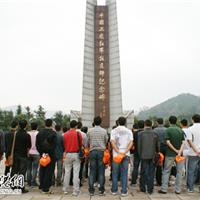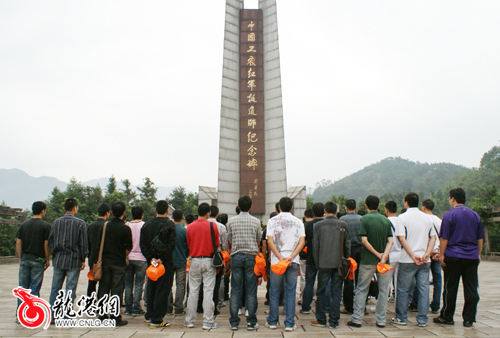 图为教师代表在中国工农红军挺进师纪念碑前默哀,缅怀革命先烈