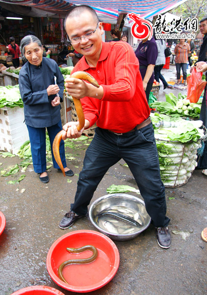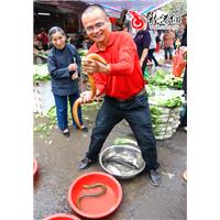 本网讯:10月14日上午,记者在苍南县龙港镇菜市场看到,一名农户在出售2条大黄鳝,引来不少群众驻足观看。