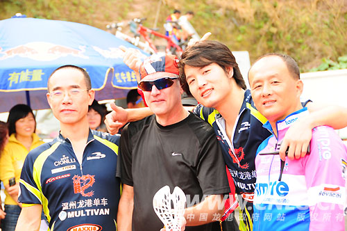 代表台州捷安特俱乐部参战的捷克籍选手ALEX,是本比赛唯一一名“洋骑手”,自然也吸引了不少眼球。赛后与龙港单车俱乐部参赛队员拉着合影,好在ALEX也有求必应,还摆出各种不同的“pose”。