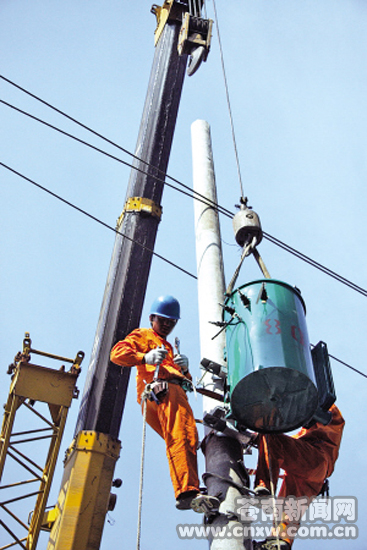 苍南新闻网11月8日消息:日前,苍南电力公司技术人员将一台容量为80千伏安的单相变压器安装到了龙港镇下垟郑花园街的一根电杆上,这也是首批30至80千伏安单相变压器在我县试点投运使用。据介绍,它较三相变压器具有损耗低、体积小、有利提高电压质量等优点,每台单相变压器可供20多户居民照明。