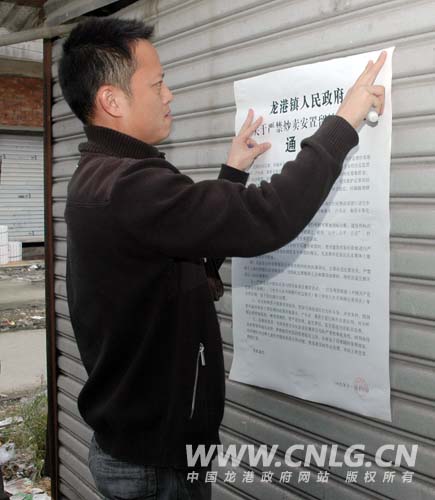 图为工作人员粘贴禁止非法炒卖安置留地指标的通告