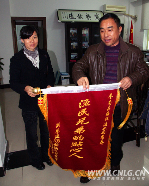 本网讯:(章国森) 2009年12月9日下午,苍南县中墩乡中墩村浙苍渔运309船渔民家属陈丽辉女士将一面绣着“渔民兄弟的贴心人”的锦旗亲手送至苍南县海洋与渔业局吴正林局长手里,并连连道谢!