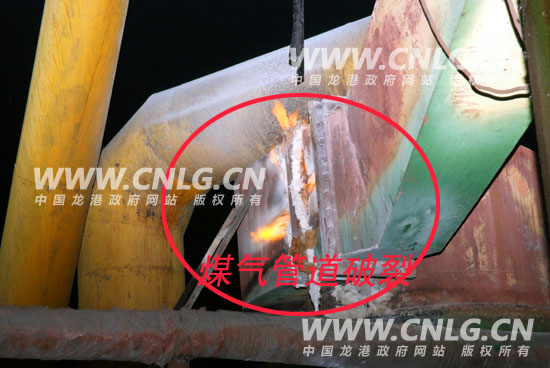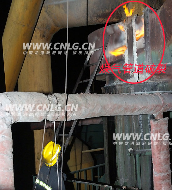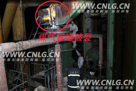 首批救援力量龙港中队接警后5辆车于23时34分到达现场,所有车辆停靠在单位北侧城南路待命,由侦察小组到事故点进行灾情侦察。经侦察发现,煤气泄漏部位是位于处煤气转换站内1号煤气发生炉的3楼的除尘装置管道接头处,裂缝长达50余厘米,已形成稳定燃烧,蓝色火焰伴随着呼呼的着火声不断往外窜。由于生产工艺限制,煤气发生装置还处于工作状态,正源源不断的生产煤气,在事故没有处置完毕之前不能停止生产。但如果处置不当,将会在管道及整个炉内形成负压引起回火而发生大爆炸,在没有很好的处置对策之前,最好的办法就是让其稳定燃烧,也不能对其实施冷却。该煤气转换站内共有煤气发生炉3个,通过现场厂方技术人员了解,炉内尚有40余吨煤,炉体及管道内都充满了高压煤气,情况非常严重。