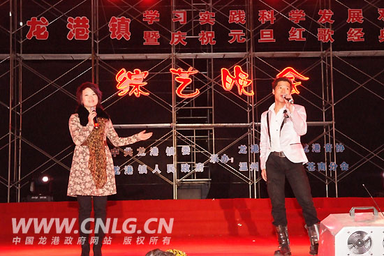 本网讯:12月26号晚上,虽然天气寒冷,但是龙跃外滩歌声阵阵,非常热闹。龙港镇学习实践科学发展观暨庆元旦红歌经典综艺晚会正在这里举行。
