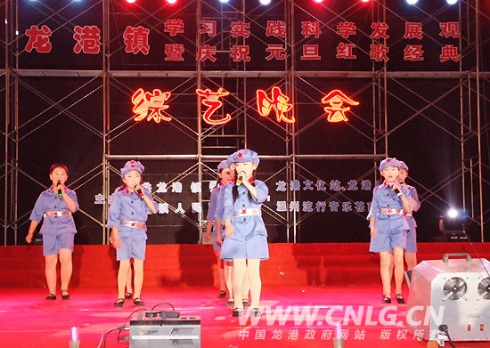 据了解,学习实践科学发展红歌经典晚会由龙港镇委、镇政府主办,龙港文化站、温州流行音乐苍南分会承办,龙港音乐协会协办,从本月初开始,就已在全镇各办事处巡回演出,当晚的演出已经是最后一站。