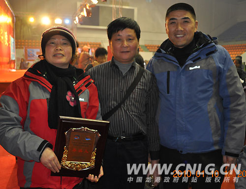 我镇冬泳协会会员林玉燕(左)被授予“太姥山杯”第六届东南地区海峡两岸冬泳联谊赛冬泳人称号