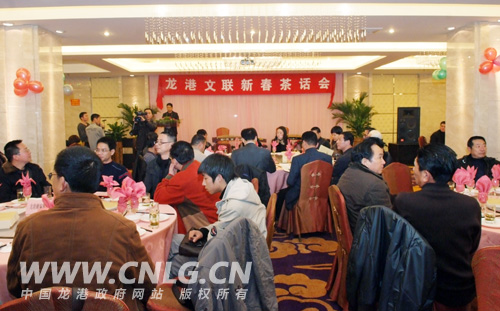 本网讯1月23日下午,龙港文联各协会成员共聚一堂,举行2010年新春茶话会,共同畅想龙港未来的文艺事业大发展大繁荣。王忠秀、上官光强、项延宝、周碧素、戴安胡、吕存阳,以及县镇文联负责人参加了茶话会。