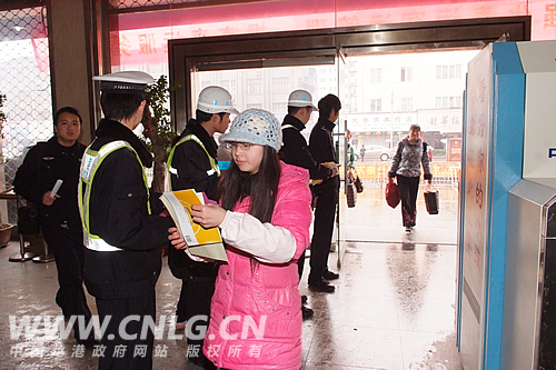 春运启动仪式结束后,参加启动仪式的领导和部门负责人还到龙港车站现场检查春运工作。交警向旅客发放“文明出行,安全春运”为主题的宣传单。