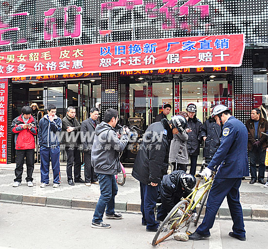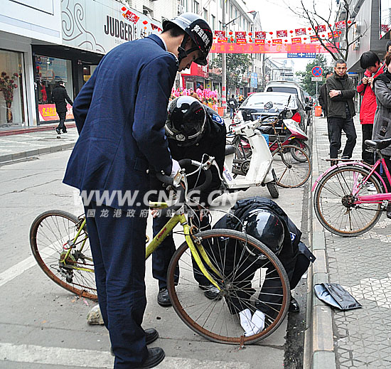 本网讯:近日,有群众向城管部门反映,说站前路某服装店门前的停车位,被人用两辆自行车牢牢得占住位置,小轿车根本无法停靠。一些市民也戏称,这是龙港最牛的两辆自行车。但是不管有多牛,城管人员今天上午还是将它们做了拆除!