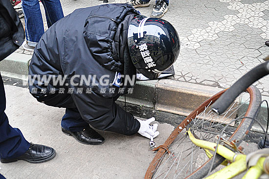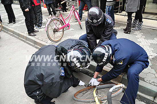 由于自行车和地面焊接的过于牢固,城管人员花了半个小时才将它拆离地面,并暂扣了被市民称之为龙港最牛的两辆自行车。