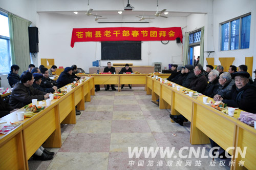 本网讯:2月3日上午,龙港片县离退休老干部新春团拜会在龙港老年大学召开,县、镇领导黄寿龙、林万乐、周碧素与老干部代表们欢聚一堂,交流情况,畅谈发展,喜迎新春佳节。