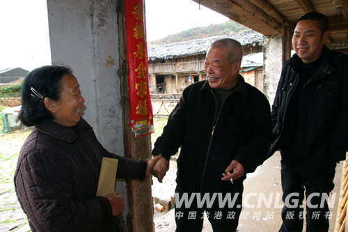 本网讯:2月4日, 苍南县渔民协会会长梅永炼来到金乡镇、大渔等渔业乡镇登门看望了原渔区渔业老干部蔡祖连、名老大虞维纣家属、名老大陈庆一、省级劳模林宏碧家属、和五次参加省级劳模会议的老书记龚显明家属等,代表苍南县渔民协会送上春节慰问金,并祝她新年快乐,健康长寿。