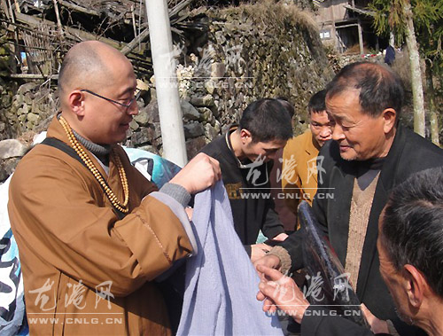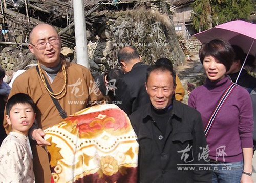 本网2月9日讯:(杨琳 老缘摄)由苍南县文明办、县团委、县工商联、县老龄委、县慈善总会义工分会、壹加壹应急救援中心共同发起,联合举办“爱心传递过大年”结对活动。龙港网站、《龙港论坛》编辑部、龙港网络团支部一向把关爱“春蕾女童”、“孤寡老人”工作列在日程活动中,春节临近,龙港论坛、龙港网络团支部再次组织爱心网民、居士开展“爱心传递过大年”活动。莒溪镇天井办事处副书记林克奖提供了天井村里最穷最需要救济的六户家庭的名单。2月9日,龙港论坛资深网民“喜笑颜开”、“港府侦察兵”、“老缘”法师、“小杨”一行6名,再次来到我县最远的村庄——莒溪镇天井办事处天井村看望9户孤寡老人和特困户并送去八宝粥、方便面、饼干、大米、油、香姑、紫菜、衣服、棉鞋和慰问金,表达新春佳节的问候和祝福并亲切地询问了她们的生活情况。