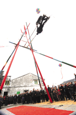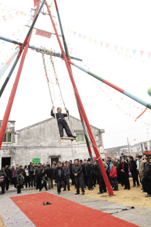 虎年初一大早,苍南县龙港镇陈家宅陈氏村民连放三声炮仗之后,便在村口祖宗留下的秋千地上,用6根大杉木高高架起一座彩色的秋千架。村里老少,吃了早饭,或拖家带口,或携男带女,纷纷围拢到秋千架下,玩起了荡秋千的娱乐活动,这是该村独特的欢庆新春的习俗。
