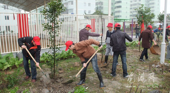 虽然天空还飘着细雨,但是这并不能阻挡志愿者义务植树的热情。挖坑、栽树、填土,一系列流程井然有序。据住在夕阳红老人公寓里的退休老干部介绍,志愿者们每年这个时候都会来开展植物、打扫卫生等活动,公寓内的其它树木也都是他们去年学雷锋纪念日期间栽种的。