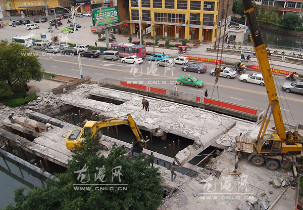 本网讯:(叶德伟 摄) 3月18日,我镇主干道龙港大道1号桥梁(飞龙桥)改建工程正式启动,南边人行道辅桥开始拆除,市民出行需绕道行走。