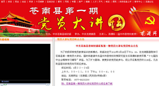 为了积极探索党员教育培训的新模式,我部决定于2010年3月26日下午2:00,在龙港影剧院举行苍南县第一期党员大讲坛,届时将邀请中共温州市委党校政策研究室主任蒋儒标教授开展“十七届四中全会精神学习辅导”讲座。为了扩大影响,使更多的党员能参与,现公开征集党员听众28名。凡在我县居住的党员均可报名参加。