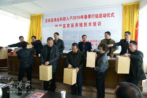 本网讯:(章国森)3月26日,苍南县渔业科技入户领导小组和苍南县海洋与渔业局在沿浦镇举办渔业科技入户2010年春季行动启动仪式暨紫菜育苗养殖技术培训班。