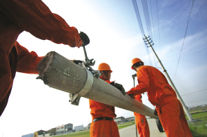 本网讯:昨天,在苍南县龙港镇环河村,电力工人在搬运刚从田头更换下的电杆。连日来,苍南电力局组织电力小分队,对排灌配变设备线路以及农排线路进行全面检查和维护,确保春耕农田灌溉用电需要。