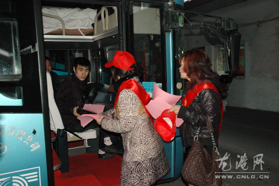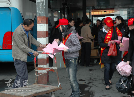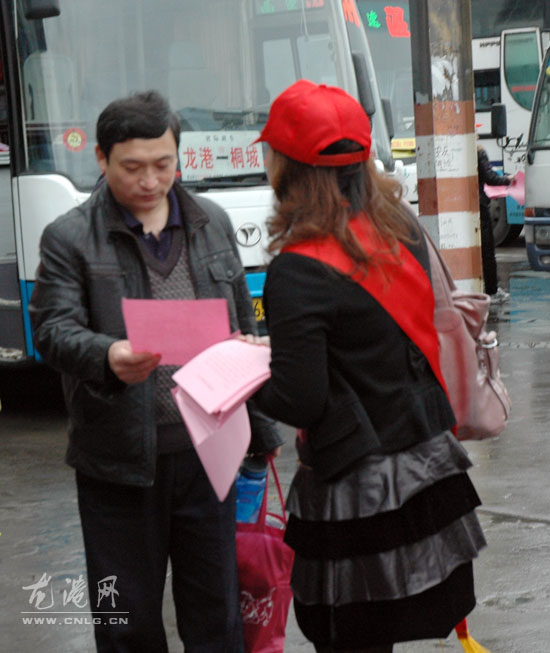 今天上午,“龙港巾帼志愿者”们身批绶带,头带红帽,走进了龙港车站,为旅客们分发“世博安保倡议书”,倡议创造和谐、安全的社会环境,共建和谐龙港,守卫世博安全。