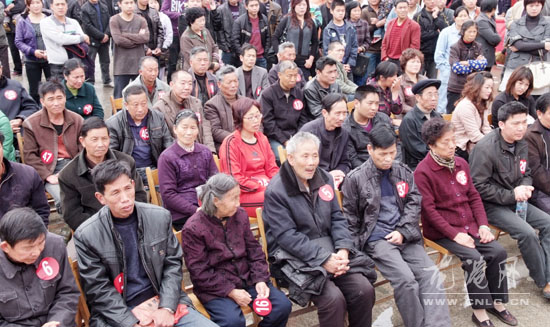 图为龙港镇副镇长吕存阳及市 县民政部门有关负责人为49位特困户发放了共5万元的福彩爱心救助款