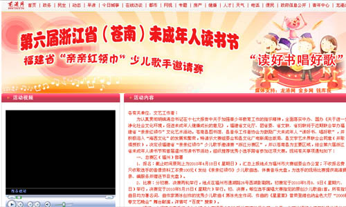 为认真贯彻胡锦涛总书记在十七大报告中关于加强青少年教育工作的指示精神,全面落实中办、国办《关于进一步净化社会文化环境,促进未成年人健康成长的意见》,福建省文化厅、团省委、省文联、省妇联将于近期联合举办福建省“亲亲红领巾”文化艺术活动。苍南县图书馆、县音乐工作者协会为鼓励广大未成年人“读好书、唱好歌”,并积极溶入“海西文化”的发展和繁荣,特请示大赛组委会和县文化广电新闻出版局、县文学艺术界联合会同意(并取得授权),决定设福建省“亲亲红领巾”少儿歌手邀请赛“浙江分赛区”,并以苍南县为主要区域,结合第六届浙江省未成年人读书节和首届温州市读书节活动,组织推荐优秀小选手跨省参加这项大赛。现将有关事项通知如下: 一、总赛区(福州)部署 1、报名:截止时间原则上为2010年4月18日(星期日),汇总上报地点为福州市大赛组委会办公室;不收报名费,只收取选手的音像资料工本费100元(发给《亲亲红领巾》少儿歌曲选、伴奏音乐光盘,为选手的现场比赛提供高清摄、录、编服务并赠送节目光盘)。 2、比赛:分初赛、决赛两轮举行,地点在福州市通湖路26号西湖影剧院。初赛定于2010年5月8、9日(星期六、日)举行,决赛定于2010年5月15日(星期六)举行。初、决赛,每位选手演唱大赛指定的原创少儿歌曲1首。所有指定曲目均为著名词、曲作家萧冰创作的优秀少儿歌曲(萧冰先生作词、作曲的《星星草》曾荣登维也纳金色大厅“2008新春文艺晚会”舞台献演,详情可“百度”搜索)。 3、评奖:由福建省音乐权威人士组成大赛评委会对选手的表演进行公开、公平、公正的评奖(按年龄段分设幼儿、儿童、少年等3个组别),并按选手所取得成绩评选优秀指导师奖;主办单位将举办大型颁奖会,为金、银、铜奖等奖项获得者颁发荣誉证书、奖杯。 4、展示:福建省文艺音像出版社将根据实际需要,在获奖者中挑选成绩最佳和最具潜质的优秀少儿歌手与其签约,录制“亲亲红领巾”音乐电视作品专辑(配套彩色歌本),公开出版发行;主办单位和《中国少先报》(海峡专版)及相关媒体将作倾力宣传、推广。 5、其他:选手差旅费等开支自理,个人安全由其监护人负全责。 二、浙江分赛区(苍南)组织 1、宗旨: (1)设立福建省“亲亲红领巾”少儿歌手邀请赛浙江分赛区,拓宽平台,创新载体,整合资源,努力扩大浙闽文化交流合作,积极营造海西经济区浓厚文化氛围,发现和培养少儿文艺新苗,不断推进未成年人思想道德建设。 (2)始终坚持大赛的公益性原则,积极鼓励广大未成年人“读好书、唱好歌”,更好凸现文化惠民,努力提供优质的公共文化服务。 2、安排: (1)福建省“亲亲红领巾”少儿歌手邀请赛浙江分赛区活动由苍南县图书馆、县音乐工作者协会根据授权而共同主办。 (2)根据需要成立分赛区工作班子,并聘请上级领导、专家担任顾问;按大赛主办单位的总体部署,通过中国社会音乐研究会浙闽边界音乐中心,联系总赛区组委会有关负责人,为浙江分赛区活动作好衔接、安排,统一上报参加总赛区比赛的选手名单。 (3)结合本地区实际,由苍南县图书馆将分赛区工作纳入第六届浙江省未成年人读书节和首届温州市读书节活动运作,尝试做好公共文化的延伸服务和深化服务;由苍南县音乐工作者协会多渠道联系有关艺术骨干,认真推荐优秀少儿歌手,鼓励按自愿组合原则开展好赛前辅导工作。 (4)分赛区选手报名时间为即日起至4月23日(星期五)止,报名时需填写报名表,并按要求交个人一寸照片2张以及户口簿、获奖证明等相关资料复印件(户口簿、获奖证明需查验原件),并向报名处领取歌本及伴奏音乐光盘。 (5)选手的推荐方式:①苍南县内,凡已获县级声乐类比赛二等奖以上的少儿歌手,可直接确定推荐;未获规定奖项的少儿歌手,可由音乐专业人员推荐报名。②苍南县以外少儿歌手的报名,可通过当地图书馆读者辅导部或知名音乐家向浙江分赛区(苍南)联系,并办理相关手续。 (6)分赛区比赛形式为:①在“五一”劳动节长假内(具体时间、地点另行通知)召集分赛区前往总赛区(福州)参赛的选手,举行赛前原创歌曲演唱点评会,邀请原创词、曲作家及有关专家担任评委,并作现场点评、指导。选手在该场“演唱点评会”上的表演成绩作为评选浙江分赛区奖项的依据。②在6月中、下旬,组织分赛区所有选手参加轻松、活泼型的读书竞赛活动(具体时间、地点另行通知),选手该项竞赛成绩作为评定分赛区获奖奖项的参考。 (7)因总赛区委托,被推荐参加总赛区(福州)比赛选手的音像资料工本费(100元),由苍南县音乐工作者协会统一代收,并按时全额上交。分赛区本身不向苍南县内报名参赛的选手收取任何费用,所做一切工作均为义务。县外选手是否要向分赛区象征性交纳报名费,视活动经费批拨情况酌定。 (8)活动全程,要求监护人陪护小选手;赴总赛区(福州)参赛的往返车票购买、住宿以及选手的服装、化妆等事项,自行解决。 (9)苍南县图书馆、县音乐工作者协会将于6月中、下旬,即于选手参加“读书竞赛”活动的同一天内,以浙江分赛区等单位名义,联合表彰参与该次大赛的优秀小选手及其指导师,发给获奖证书、奖杯及优秀图书等奖品;报请上级有关部门给予获总赛区等级奖的选手及其优秀指导师嘉奖。此外,还将评选浙江分赛区优秀组织奖(单位、个人)