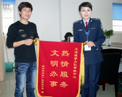 日前,龙港某广告公司为商家设置店招广告。由于商家开张在即,该广告公司希望能尽快为其设置广告。龙港镇城管大队窗口接件后立即组织相关人员进行现场勘查,在确定该广告符合相关规定之后,当即同意将许可证发放给该广告公司。原本3天才能办结的承诺件在1小时内得以办结,广告也得以及时设置。为感谢龙港镇城管大队窗口提供的便捷服务,该广告公司送上了“热情服务,文明办事”的锦旗。