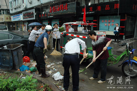 记者今天上午在沿江办事处看到,来自该办事处、村居以及龙港城镇综合管理大队的工作人员正对街道两侧的垃圾死角进行集中清理。虽然正下着雨,但是并没有挡住工作人员打扫环境清理垃圾的热情,对于一些垃圾比较集中的死角,工作人员直接叫来铲车进行全面清脏。在环境卫生大整治行动中,镇长王忠秀、镇委宣传委员金珍敏亲临现场进行督导,王忠秀指出,环境卫生整治工作涉及民生,老百姓对于能拥有一个良好的居住环境非常迫切,他要求参与行动的全体党员干部要扎实开展环境卫生整治,并形成长效机制。