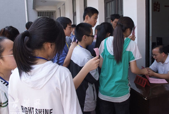 图为江山中学学生们一边听专家讲解,一边索取各种宣传资料