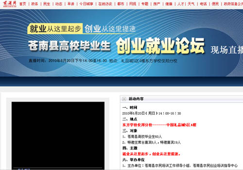 活动内容一、时间2010年6月20日(周日)14:00-16:30二、地点东方学校仪邦分校-------中国礼品城5区4楼三、对象1、苍南县高校毕业生60人2、特邀主席台嘉宾6人,特邀嘉宾19人四、主题就业从这里起步,创业从这里提速。六、举办单位1、主办单位:苍南县农民培训工作领导小组、苍南县农