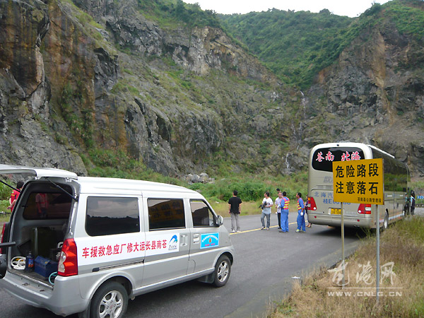 情景二为营运车辆紧急施救排故。运政96520受理中心接报,载有18名乘客的中型客车在苍南观美78省道4公里处发生机械故障,导致车辆抛锚。事发时恰逢台风汛期,又因事故车辆抛锚于自然灾害(山体滑坡)多发地段,严重影响车上人员安全及道路运输的畅通,需要紧急救助。应急领导小组接到应急求助后,详细登记求助信息,随即打开谷歌电子地图系统搜索事发地地质情况,根据谷歌地图显示,发现该地段是山体滑坡多发地段,以就近抢修及专业车型原则迅速向辖区应急救援企业(苍南长运大修厂)下达紧急救援命令。根据谷歌地图显示,发现该地段是山体滑坡多发地段,立即通知求助人员:我们发现该地段为山体滑坡多发地段,请马上在车辆后方