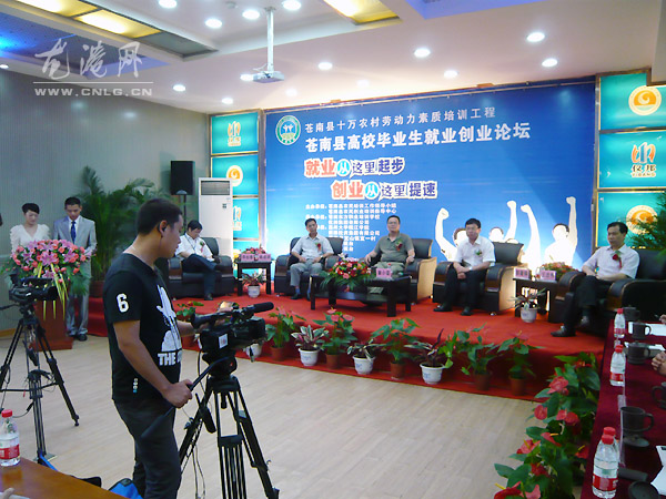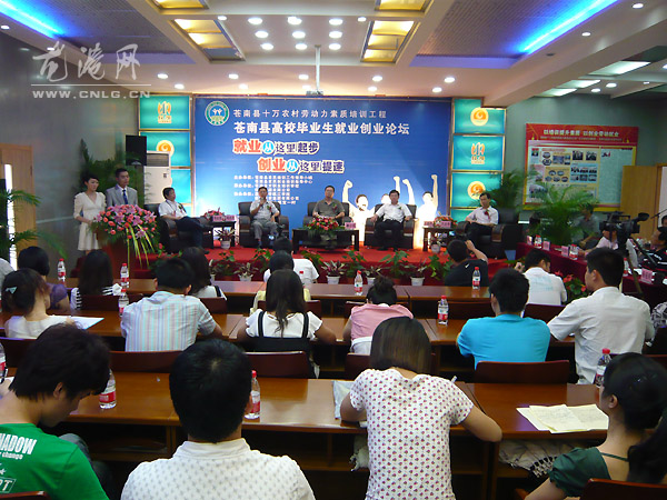 本网讯:6月20日下午,苍南高校毕业生创业就业论坛在龙港举行。活动以“就业从这里起步,创业从这里提速”为主题,旨在通过总结、交流、研讨,在全县营造自主创业的浓厚氛围,引导苍南更多大学毕业生了解创业、关注创业、投身创业、成功创业。副县长邵潘锋、龙港镇镇长王忠秀出席论坛,市、县农办负责人、县农培领导小组、全县企业界代表与学生代表共聚一堂,共商高校毕业生创业就业话题。