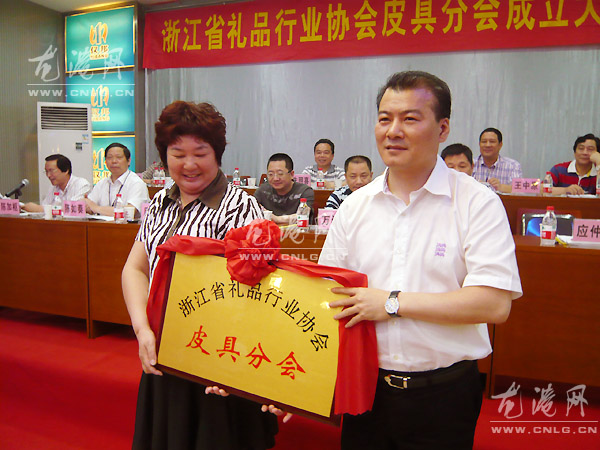 浙江省礼品行业协会会长应仲树为皮具分会会长林敏授牌