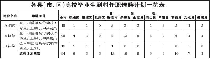 四、报考条件:1、年龄在30周岁以下(1980年7月10日以后出生);2、政治素质好,热爱祖国,拥护党的基本路线和方针政策;3、具有敬业精神,热爱农村工作,遵纪守法,作风正派;4、身体健康;5、其它资格条件详见《各县(市、区)高校毕业生到村任职选聘计划一览表》