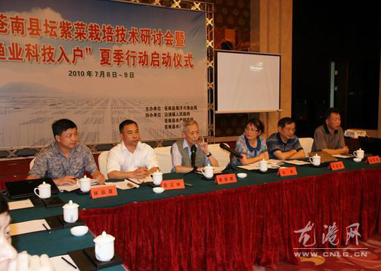 会上,苍南县海洋与渔业局局长吴正林做重要讲话并宣布启动仪式开始。会议针对坛紫菜冷藏网栽培关键技术;坛紫菜冷藏网养殖与推广模式;坛紫菜全浮流栽培技术及近年来各地的紫菜养殖情况;发展海洋藻类养殖对海洋环境改善的意义等开展学术交流和演讲。