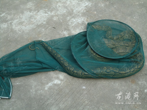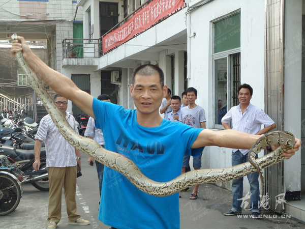 出警到现场的民警也立刻带来了专业的捕蛇工具,同行的还有一个稍稍懂得蛇性的综治巡防队员周荣耀。在相互配合之下,周荣耀上前用右手掐住莽蛇七寸,左手紧握蛇身,将其装进网兜。据目测,这条大莽蛇身长约2.4米,重10斤有余,有成人手臂粗,浑身是土黄色花纹。